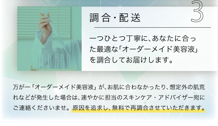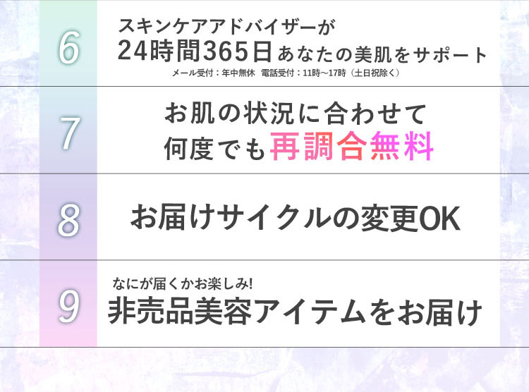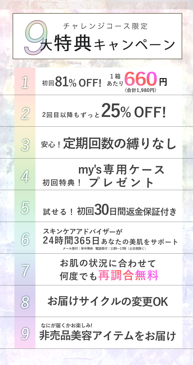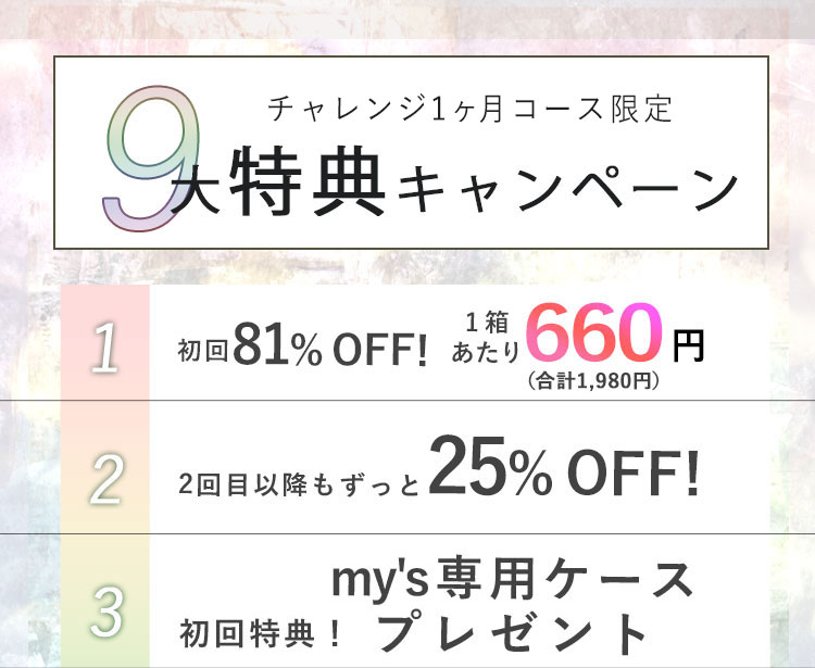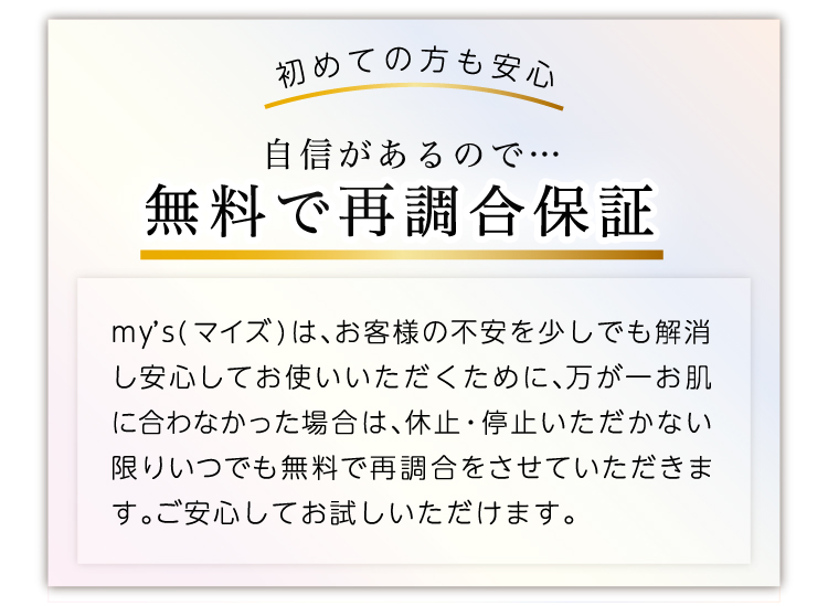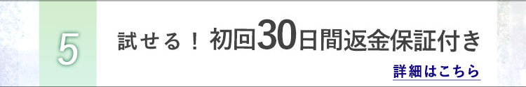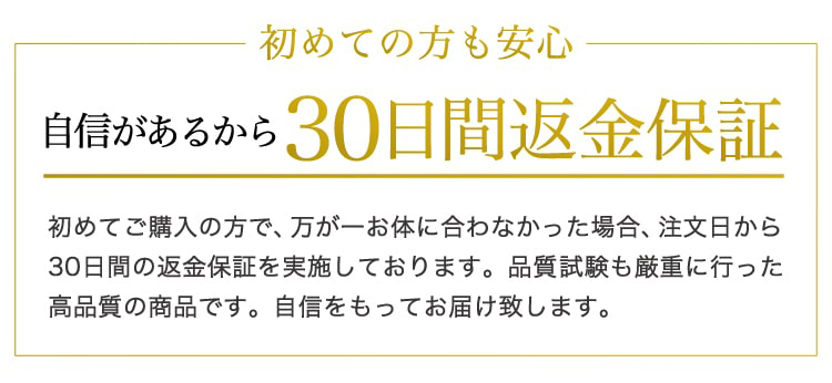 万が一、お肌に合わなかったときのために注文日より30日以内に、お問い合わせ窓口(050-3154-9884)までご連絡いただければ、初回お届け分の代金をご返金致します。