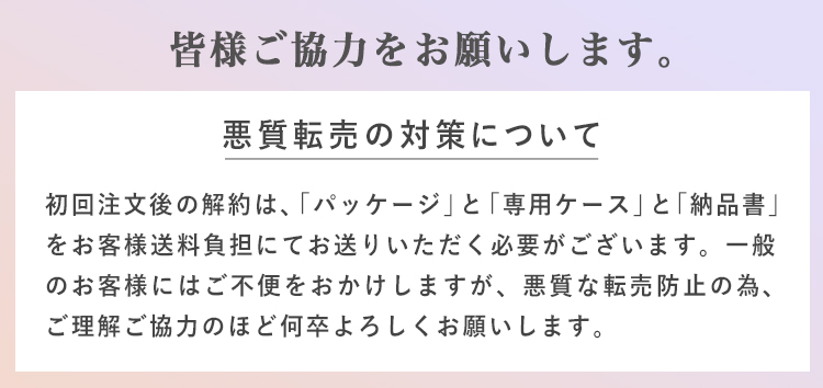 - 初回解約に限り、悪質転売対策として「パッケージ」と「専用ケース」と「納品書」をお客様送料負担にてお送りいただく必要がございます。